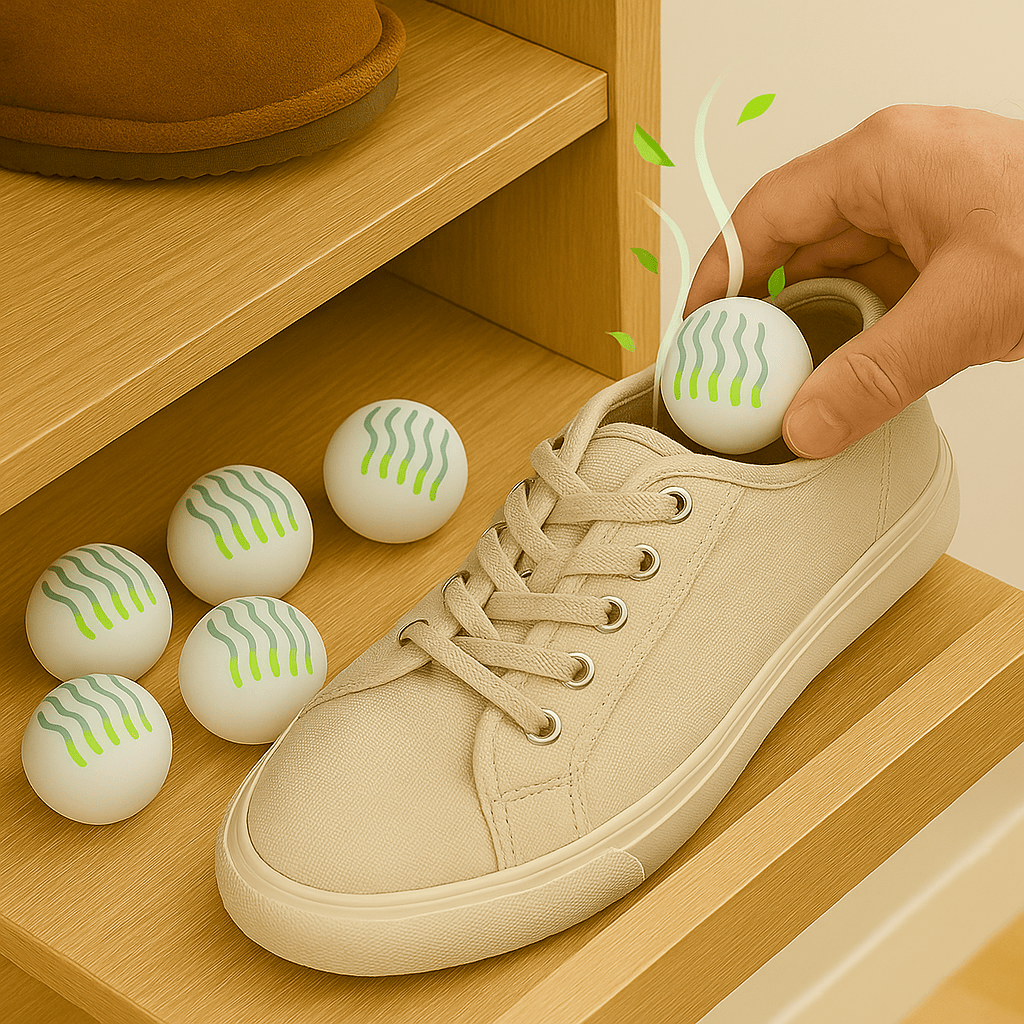 Déposez une bille dans chaque chaussure ou tiroir – elle agit automatiquement pour absorber les mauvaises odeurs et l’humidité.